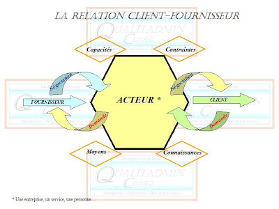 A notre poste de travail, acteur de l’entreprise, nous avons un ou des fournisseurs internes, qui nous fournissent « la matière » pour effectuer notre tâche. A notre tour, après avoir apporté notre valeur ajoutée à la matière fournie, nous devenons fournisseur d’un autre poste. Ainsi tour à tour, nous sommes tantôt client, tantôt fournisseur.
